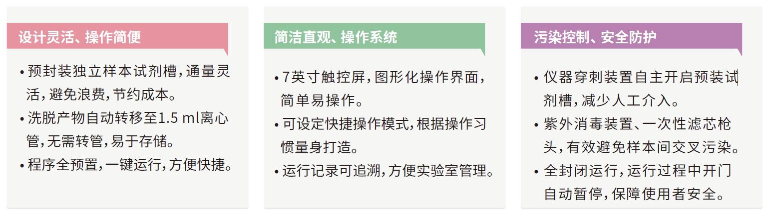 采用磁珠分离技术从血液、细胞、组织、细菌等多种样品中全自动提取核酸。提高效率,减少失误。